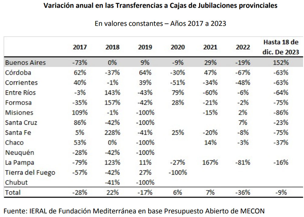 Aunque existe otra forma de plantear el problema; el mayor recorte sería sobre la provincia que más participación ganó en la distribución de transferencias discrecionales entre 2017 y 2023. Por ejemplo, en el caso de las Transferencias a Cajas de Jubilaciones Provinciales, en el año 2023 la provincia fue la única a la que se enviaron cuantiosos fondos adicionales (152% extra hasta diciembre, con relación a 2022, en valores reales), siendo que al resto de las provincias los envíos cayeron fuertemente este año (por ejemplo, -63% a Córdoba, -75% a Santa Fe y -86% Misiones).