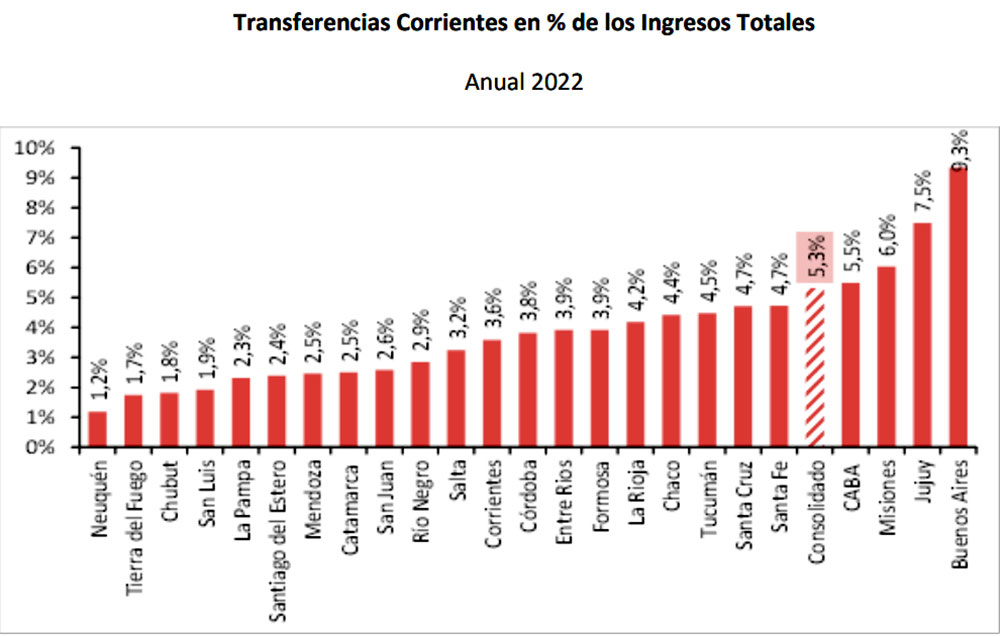 La Rioja lidera, seguida luego por Santiago del Estero (9,4%), Chaco (8,0%), Misiones (7,8%), Tucumán (7,2%), Formosa (6,4%) y Catamarca (6,4%), ubicándose todas estas por encima de la media nacional, al tiempo que por debajo de la misma se posicionan Salta (5,5%), Corrientes (4,9%) y Jujuy (3,4%). No es casualidad que estas dos provincias sean las de menores transferencias sobre sus ingresos: se trata de los dos gobiernos locales con signo opositor al gobierno central en el período analizado.