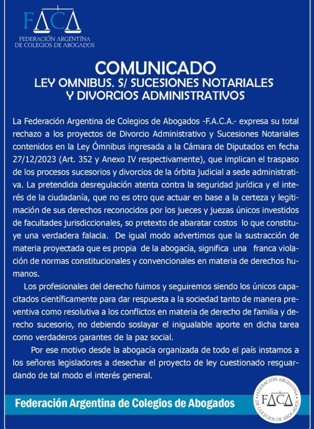 La Federación Argentina de Colegios de Abogado expresó en un comunicado su total rechazo a los proyectos de Divorcio Administrativo y Sucesiones Notariales contenidos en la Ley Ómnibus que el presidente Javier Milei envío al Congreso, que implican el traspaso de los procesos sucesorios y divorcios de la órbita judicial a la sede administrativa.