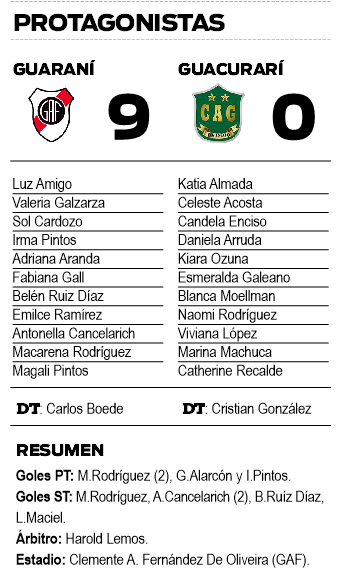 Las chicas franjeadas no tuvieron contemplaciones y aplastaron a Guacurarí por 9-0 en el Clemente Argentino Fernández De Oliveira, en el corazón de Villa Sarita. Macarena Rodríguez, una de las abanderadas de Guaraní, marcó tres tantos. También gritaron Antonella Cancelarich (2), Gabriela Alarcón, Irma Pintos, Belén Ruiz Díaz y Ludmila Maciel para el team dirigido por Carlos “Tuti” Boede, que tiene como capitana a la defensora Fabiana Gall.