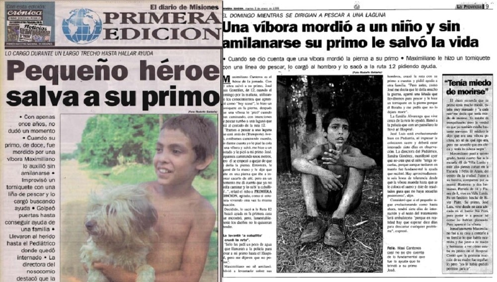 Maximiliano Canteros tenía 11 años cuando se “recibió” de héroe el domingo 3 de enero de 1999. Ese día salvó a su primo, José Luis, de 12, cuando, gracias a los conocimientos que adquirió como scout, le hizo un torniquete en la pierna después de que una víbora le mordió cuando iban caminando con intenciones de pescar en una laguna al costado de la ruta 12, en inmediaciones de Villa Poujade (Posadas).