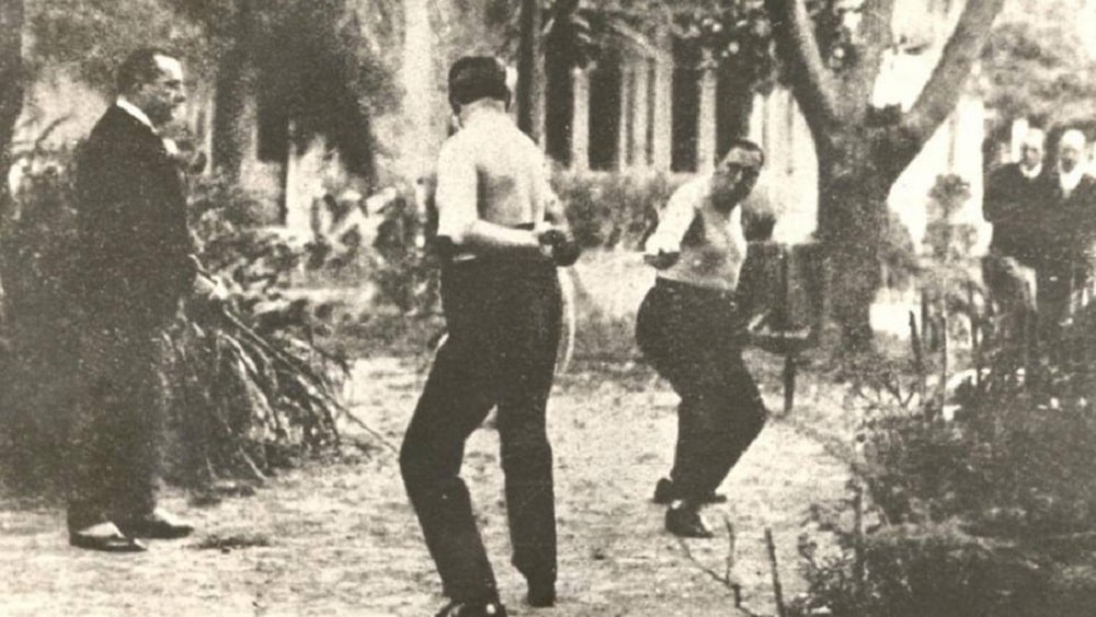 El político rosarino era un experto en esgrima, mientras que su oponente debió tomar clases para el suceso.