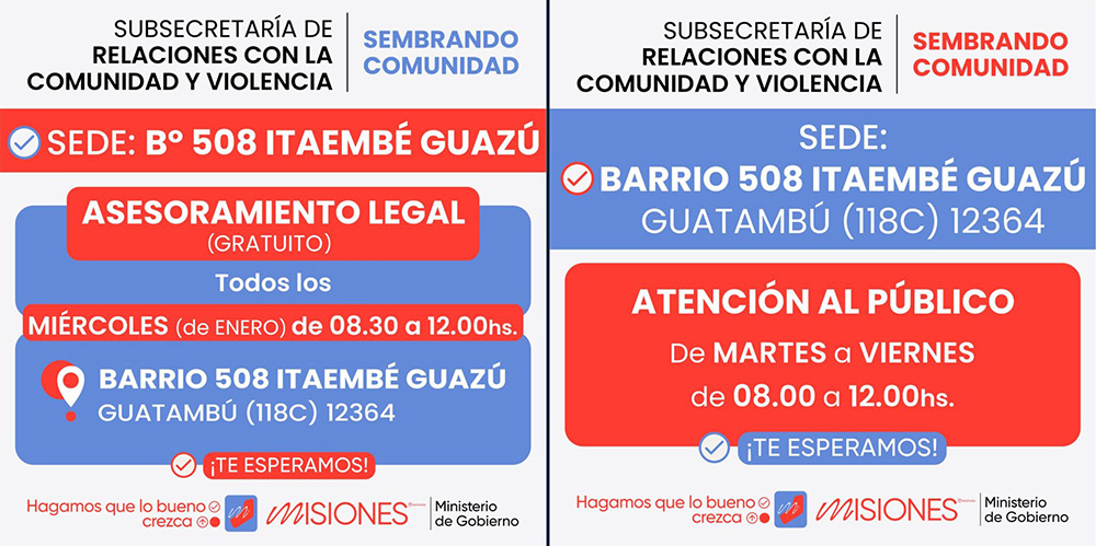 La Subsecretaría de Relaciones con la Comunidad y Violencia de Misiones, abrió esta semana una nueva sede en el barrio Itaembé Guazú de Posadas desde donde se atenderá de manera gratuita los casos de violencia con asistencia psicológica y asesoramiento legal.