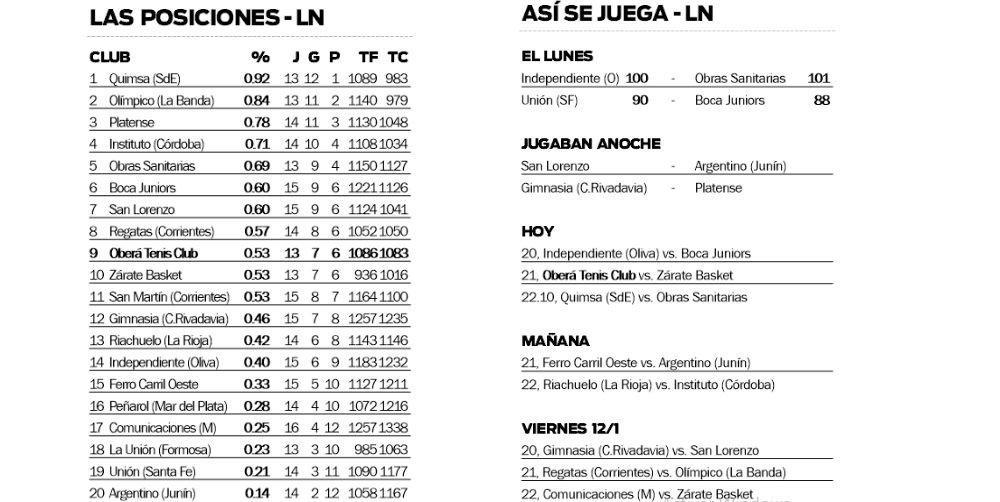 Vale resaltar que la temporada de la Liga Nacional de básquetbol se reinició el último lunes con el agónico triunfo de Independiente de Oliva en Córdoba frente a Obras Sanitarias, por 101-100; y el sorpresivo traspié de Boca Juniors en Santa Fe ante Unión, anteúltimo en la tabla, por 90-88. Anoche, al cierre de esta edición, San Lorenzo recibía a Argentino y Gimnasia hacía lo propio ante Platense.