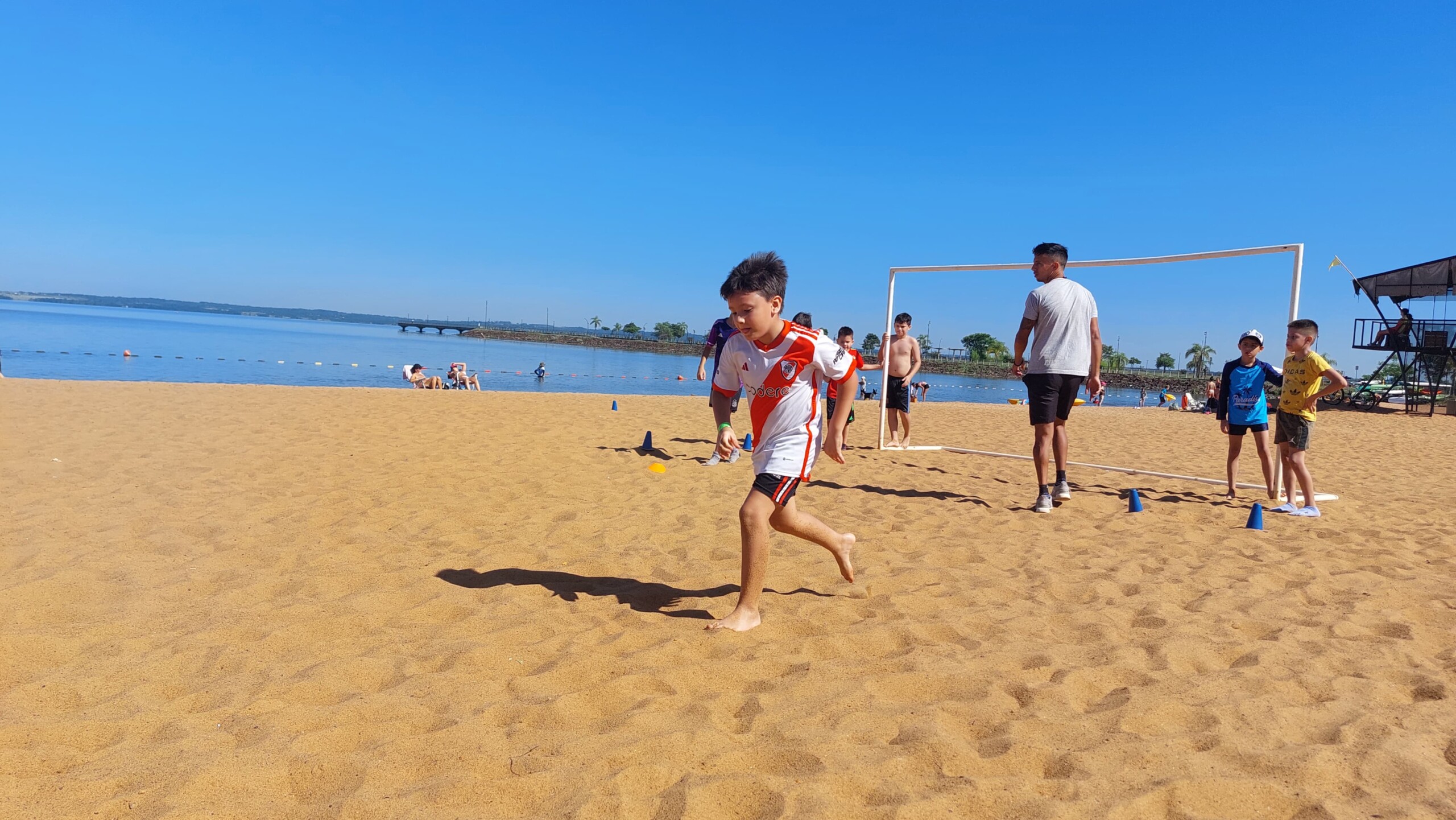 Los niños se reúnen a orillas del río para divertirse y entrenar en la playa de El Brete, en las clases de Fútbol Playa que se dictan tres veces por semana a cargo del profesor Agustín Toledo, y que se transformó en uno de los potreros de Posadas.