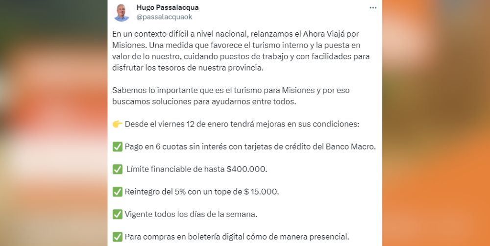 En medio de un contexto desafiante a nivel nacional, el gobernador de la provincia de Misiones, Hugo Passalacqua, anunció el relanzamiento de “Ahora Viajá por Misiones”. Una medida enfocada en estimular el turismo interno y resaltar las riquezas turísticas locales, con especial atención a la protección de empleos y la colaboración conjunta para superar las dificultades actuales.