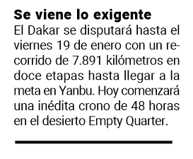 Por su parte, el qatarí Naser Al Attiyah (Toyota), bicampeón defensor en autos, obtuvo su primera victoria ayer y se ubicó como escolta de la categoría, detrás del saudí Yazeed Al Rajhi (Overdrive).