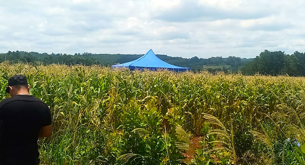 ENTRE LAS PLANTAS DE MAÍZ. Debajo del gazebo, en la escena del hallazgo del cuerpo, trabajan los profesionales en criminalística de la Policía Científica para recoger evidencias.