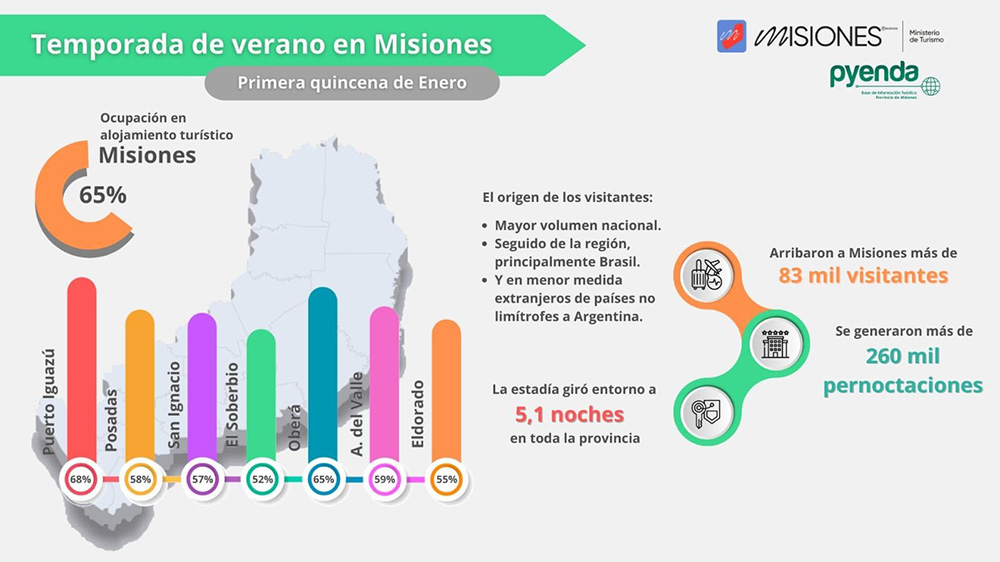Durante la primera quincena de enero la ocupación de alojamiento promedio en Misiones estuvo entorno al 65%; con la localidad de Puerto Iguazú a la cabeza registrando un 70%.