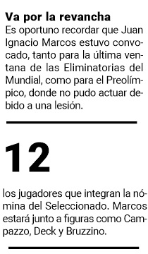 Vale recordar que Marcos estuvo convocado, tanto para la última ventana de las Eliminatorias del Mundial, como para el Preolímpico, donde no pudo actuar por una lesión. Ahora se presenta la oportunidad inmejorable para realizar su debut en la Mayor, aunque todo dependerá de la evolución de la molestia que sufrió en el último partido con su equipo.