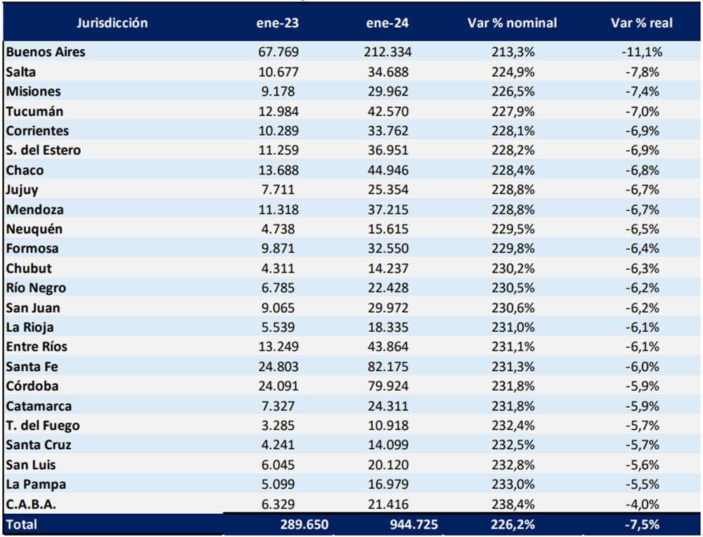 El IARAF lo explica de la siguiente manera: “Dados estos ratios, es posible calcular el impacto real de las variaciones de estos envíos en los ingresos totales de cada jurisdicción. La caída del 7,5% de las transferencias automáticas nacionales del consolidado, serían equivalentes a una caída real del ingreso total del consolidado de 3,5% real en enero respecto al año pasado”.