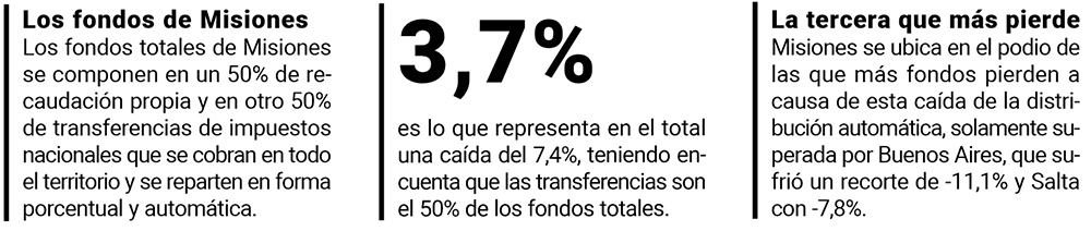 Durante enero la dependencia de Misiones de las transferencias automáticas fue exactamente el 50%. La otra mitad de sus recursos se compone de recaudación propia. De esta manera, una caída de 7,4% de los fondos girados por la Nación repercute, en términos reales, en una porción de 3,7% del total de sus recursos.
