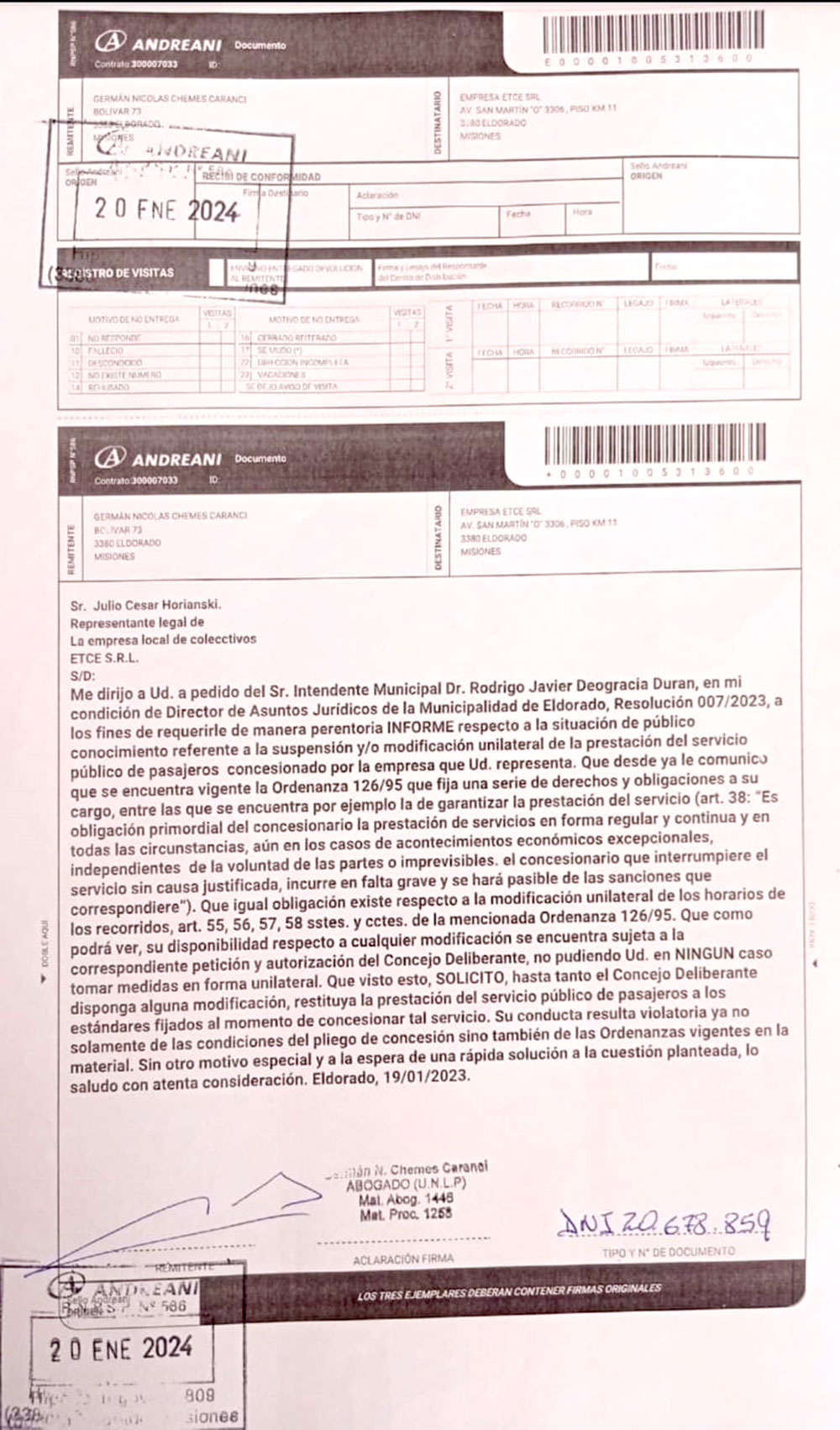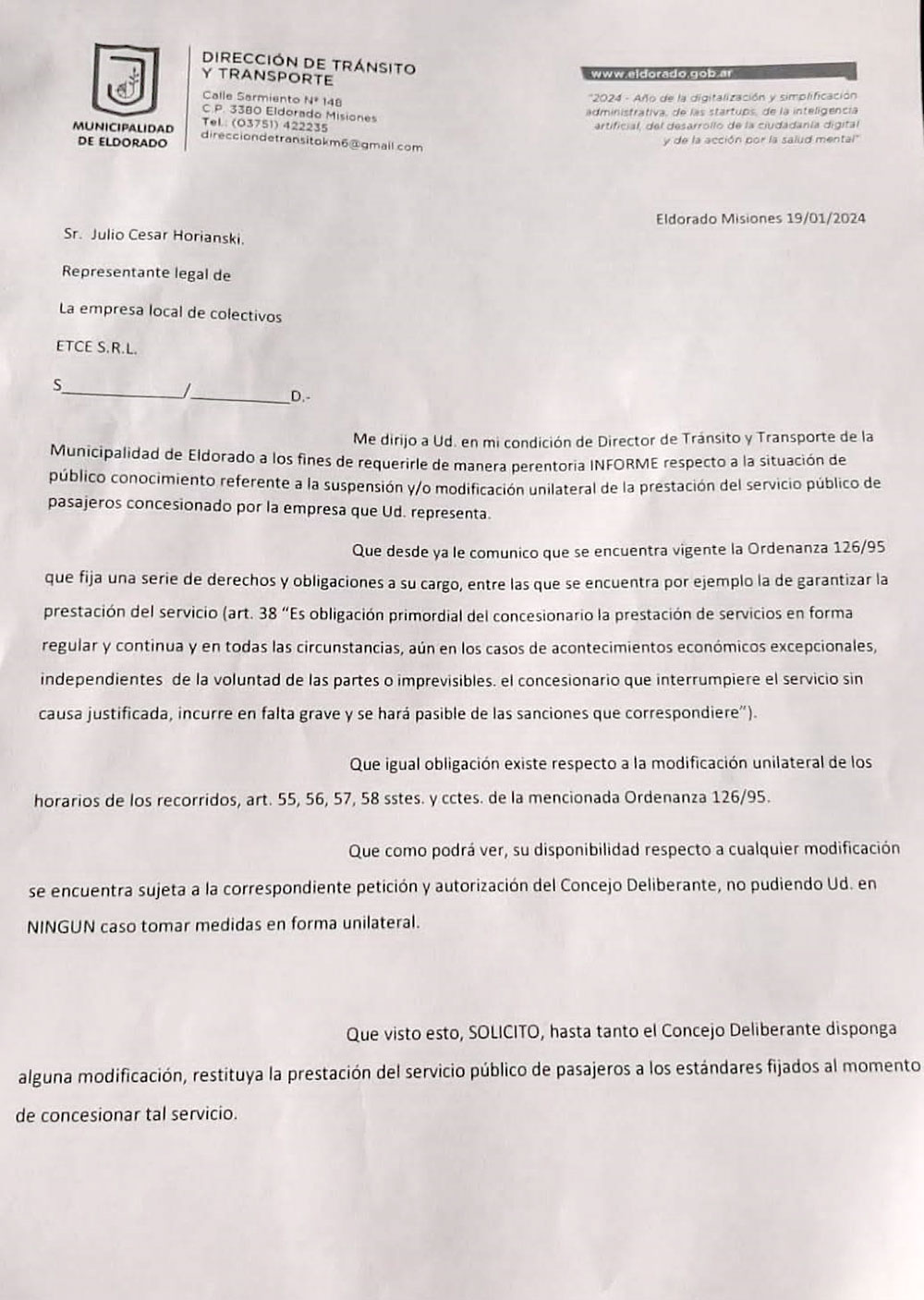 Asimismo, el director de Tránsito y Transporte de la Municipalidad de Eldorado, Fernando Luis Caro, también envió una nota dirigida al representante legal de la empresa de colectivos ETCE SRL.