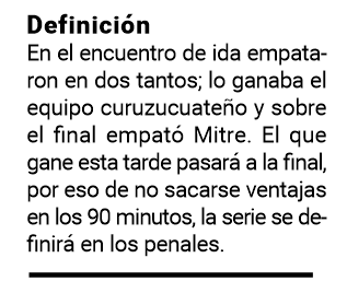 El estadio Tito Cucchiaroni seguramente se vestirá de gala para recibir hoy el partido de vuelta entre Bartolomé Mitre y Victoria de Curuzú Cuatiá (Corrientes), a partir de las 17 y por las semifinales de la región Litoral Norte del Torneo Regional Federal Amateur de fútbol.