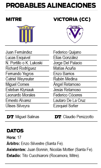 Si bien, Victoria no confirmó el once titular, el entrenador Claudio Penizzotto tiene complicado el mediocampo, porque debe reemplazar a César Esteche Cabrera, expulsado y baluarte de la mitad de la cancha de la V.