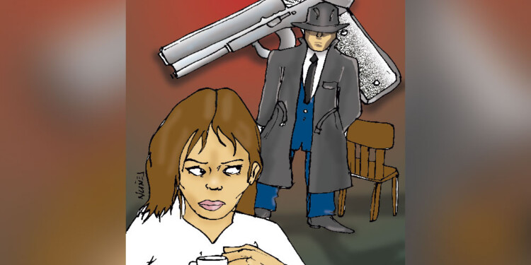 En un momento, el ser siniestro corre la silla, y comienza a erguirse como en cámara lenta, sigo sus movimientos, bien mostrados como en una película. Simulo que me concentro en el pocillo pero no lo pierdo de vista con el rabillo del ojo izquierdo. Se acerca a mí, me recorre un escalofrío por toda la columna, creo detectar que aparta el sobretodo llevando la mano derecha a la parte de atrás de la cintura. Me negaba a mí misma que pudiera estar sacando un arma. ¿Por qué? ¿Para qué? Es un total desconocido. Claro, desconocido son todos, hasta yo soy una desconocida para mi consciente, para mis neuronas, para mi cuerpo. Unos pasos más y casi me roza con el caño oscuro, maléfico de su arma que ahora sí compruebo que es una pistola ¿o es un revólver? La verdad es que no sé nada sobre estas herramientas asesinas. Un pantallazo trae a parte de mi memoria la pistola 45, pesada, grande, negra, que portaba mi padre policía en una cartuchera sobre la cadera derecha. No me pongo nerviosa ni miedosa, no lucharé, ni huiré, será lo que tenga que ser… Todo eso pienso mientras él se acerca.