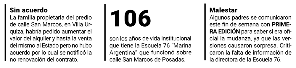 Según pudo confirmar en exclusiva PRIMERA EDICIÓN, la decisión de mudar la Escuela 76 “Marina Argentina” es un hecho. Fuentes oficiales explicaron que hay un plan en marcha y que terminará de ejecutarse el mes próximo, con las dificultades que acarrea el receso escolar para hacerlo.