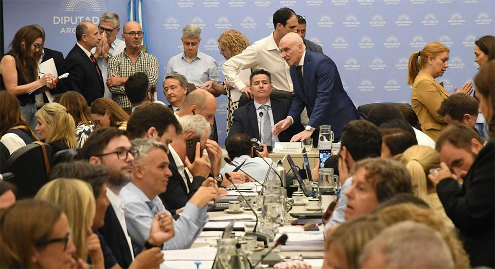El despacho se trataba en una tensa reunión plenaria de las comisiones de Legislación General, Asuntos Constitucionales, y Presupuesto y Hacienda, conducida por los libertarios Guillermo Bornoroni y Nicolás Mayoraz, y José Luis Espert de Avanza La Libertad.