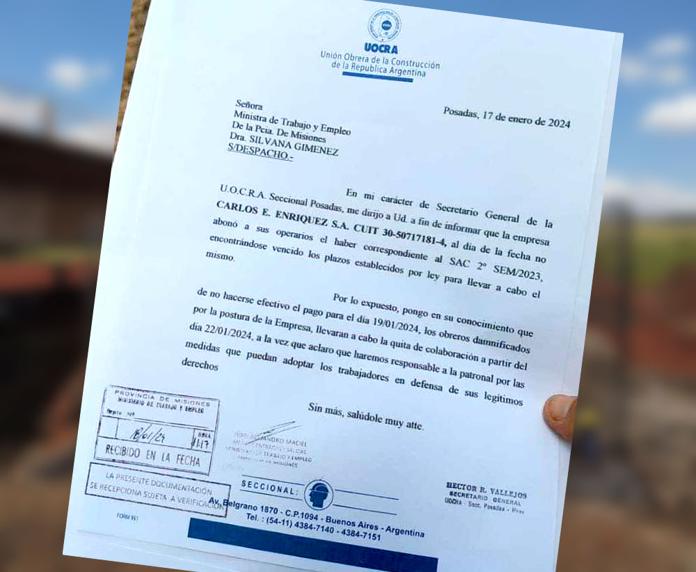 En la nota del gremio a la ministra se informó que “la empresa Carlos Enríquez al día de la fecha no abonó a sus operarios el haber correspondiente al segundo aguinaldo de 2023, encontrándose vencidos los plazos establecidos por ley”.
