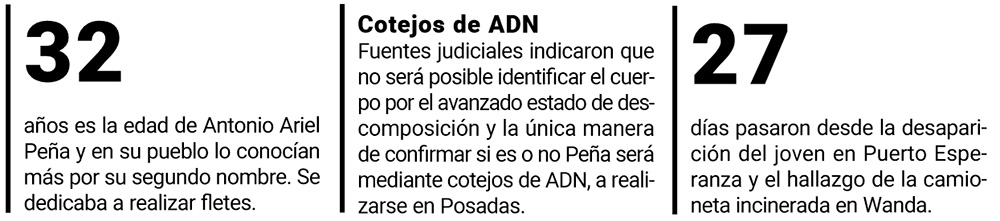 El contacto de la joven fue a través de una aplicación de mensajería con este Diario y confirmó en un breve texto que “anoche (por el miércoles) trajeron la camioneta y todo a Puerto Esperanza, pero a nosotros no nos dijeron si quiera para ir al lugar. Recién ayer (jueves) esperamos más de dos horas en la comisaría para que nos lleven y es lo único, no nos dicen más nada y que hay que esperar hasta el lunes cuando se sabría si es o no él”, dijo.