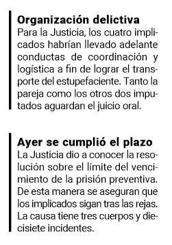 La pareja y tal como quedó plasmado en el operativo de Gendarmería, era la encargada de transportar el estupefaciente, mientras que se cree que “Leito” oficiaba de nexo con los proveedores, y se utilizaban otros vehículos que hacían de puntas o “guías” (es decir aquellos que van delante del que transporta el estupefaciente para ir visualizando los posibles controles de las fuerzas de seguridad preventivas), en este caso dicho rol habría sido llevado a cabo tanto por “Leito” como por “Feni”.