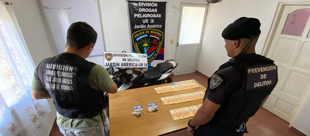 En las últimas horas, en el playón deportivo del barrio Hermoso de Jardín América, personal de la Policía de Misiones interceptó a un hombre comercializando marihuana. En su poder secuestraron dosis fraccionadas de la droga y más de 300 mil pesos argentinos en billetes de distintas denominaciones, además de la motocicleta en la que se desplazaba.