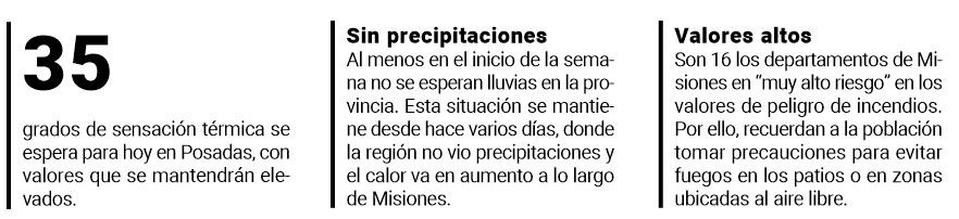 Para este lunes, la temperatura máxima en la provincia se estima en 33 grados, pero con una sensación térmica de 35 en Posadas. En tanto que el martes y miércoles el incremento del calor se sentirá en otros municipios, con una máxima de 35 grados pronosticada para el miércoles en Puerto Iguazú y una sensación térmica en aumento.