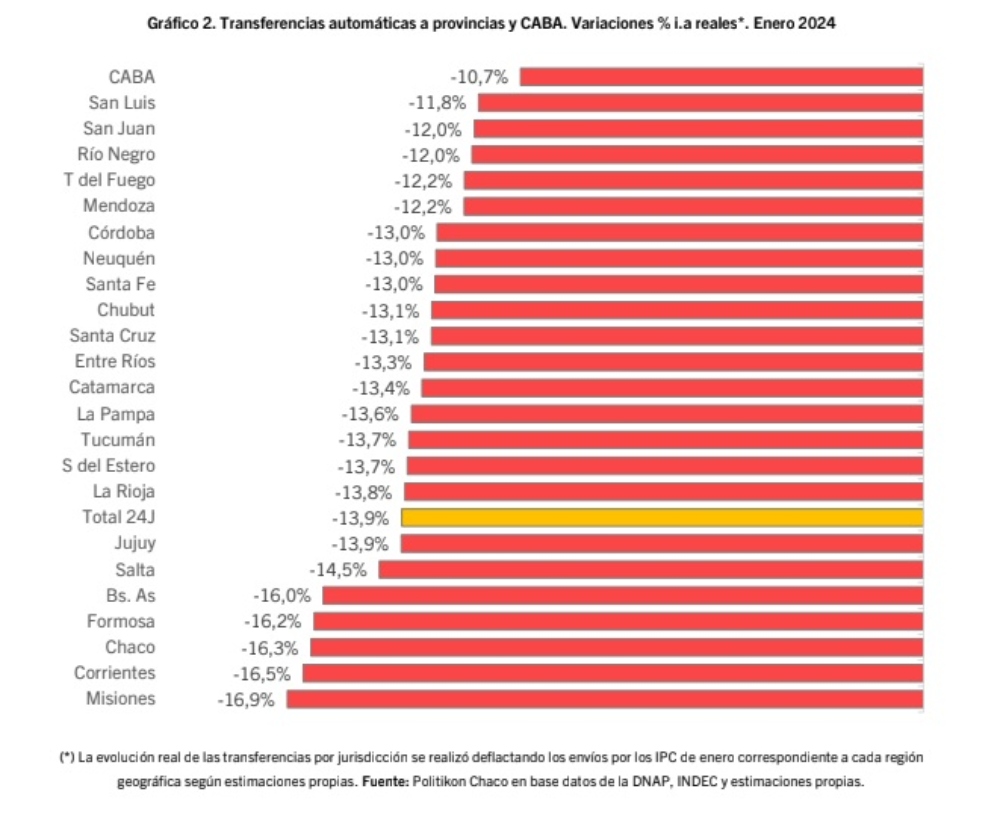 Allí se consignó una baja de 12,2% en términos reales comparando enero 2023 con el mismo mes de 2024 en las transferencias automáticas por coparticipación, leyes complementarias y compensaciones.