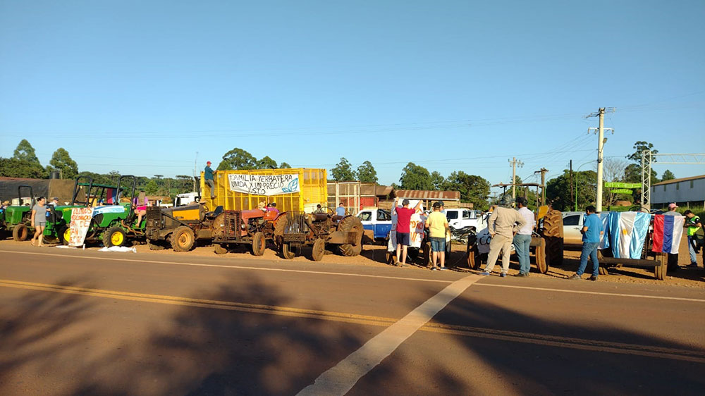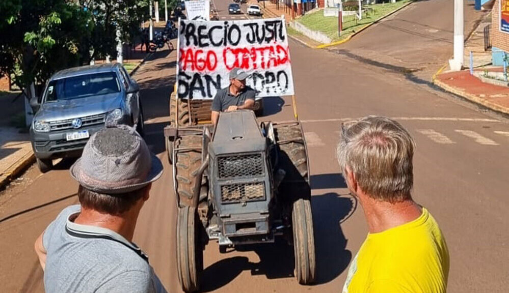 Con banderas argentinas, de Misiones y carteles que rezan “Precio Justo contado $505” y “60 centavos de dólar hoja verde ya”, los tractores realizaron una caravana por la ruta nacional 14 y calles principales del municipio.