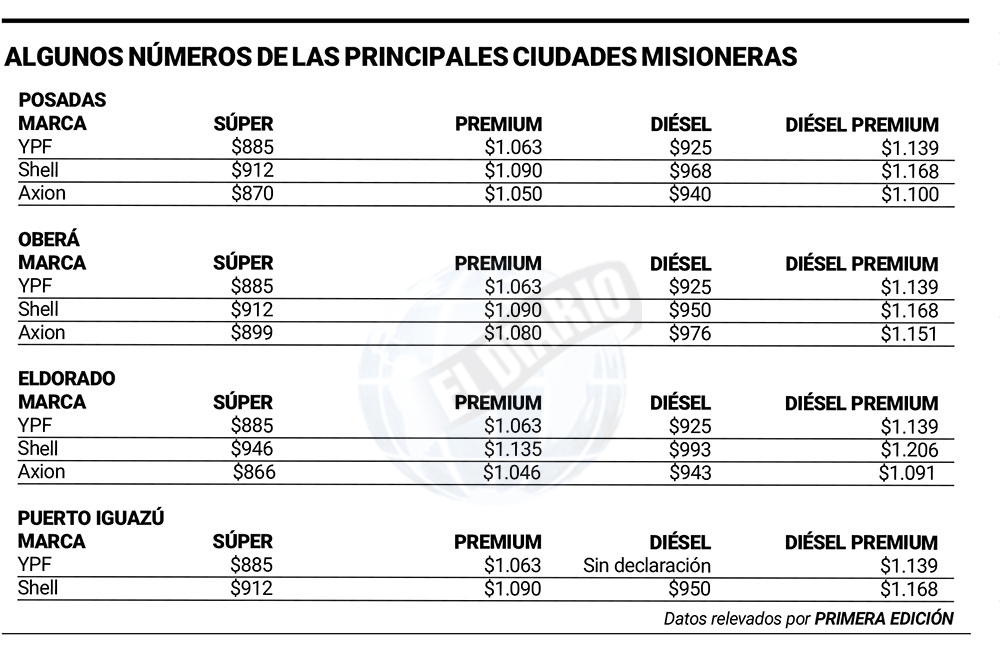 Por último, la Axion de esta localidad, tiene la súper a $866 (por debajo de los otros municipios de la provincia, incluido Posadas), la premium (quantum) a $1.046, el litro de diésel común a $943 y la diésel premium a $1.091. Estos últimos, según lo declarado en el sitio web del Ministerio de Energía de la Nación.