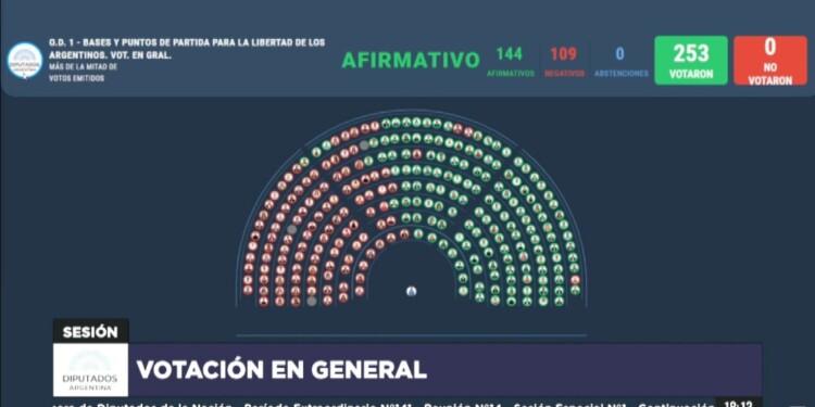 El proyecto de ley “Bases y Principios para la Libertad de los Argentinos”, que perdió en el camino más de la mitad de sus artículos, fue aprobado en general con los votos libertarios, los del PRO, la UCR, Hacemos Coalición Federal e Innovación Federal. En total, obtuvo 144 votos a favor y 109 en contra.