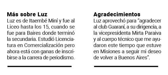 Estuve dos años y medio en SAT y por motivos personales decidí irme del club. Me fui en condición de libre y volví a Misiones a mediados del año pasado. Quería estar un poco con mi familia. A mi regreso empecé a jugar para Guaraní, salimos campeonas del torneo de la Liga Posadeña y clasificamos a las instancias previas de la Copa Federal. De todas maneras, siempre tuve el objetivo de seguir entrenando porque yo quería volver a jugar en un club de Buenos Aires. Seguí entrenando y conseguí una prueba en Banfield. Vine a probar y a la semana me llamaron, me dijeron que querían arreglar conmigo y me vine a jugar a Banfield.