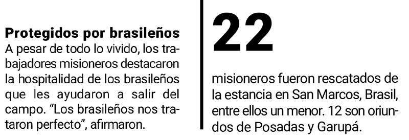 A pesar de ser asistidos por las fuerzas federales brasileras, los trabajadores temen aún por las constantes amenazas que reciben por parte de los contratistas. “Nos amenaza porque tiene gente en la frontera, hay cambistas que recluta gente para él y tiene muchos familiares por ahí”, explicó el trabajador que se animó a denunciar la situación que atravesaban con la Justicia brasileña.