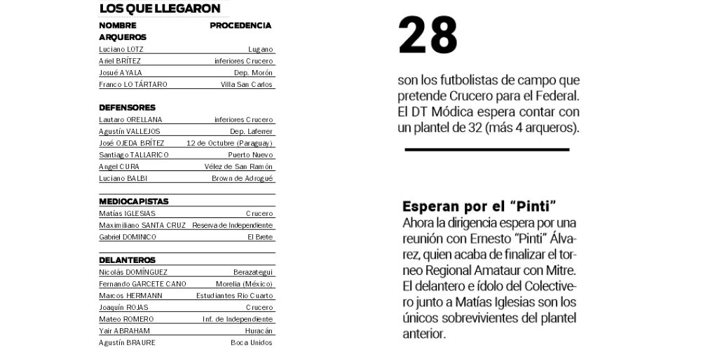 En la agenda aparecen otros probables amistosos para más adelante, como por ejemplo el choque con Guaraní de Fran. La expectativa de los hinchas de Crucero está centrada en la vuelta de su ídolo, Ernesto “Pinti” Álvarez, quien se tomará unos días de descanso tras participar del Regional Amateur con Mitre.