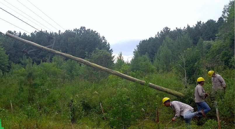 Luego de que los vientos cesaron, personal de la Cooperativa Alto Uruguay Limitada (CAUL) salieron rápidamente a tratar de solucionar el problema.