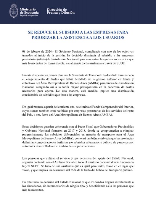 “Estas decisiones guardan coherencia con el Pacto Fiscal que Gobernadores Provinciales y Gobierno Nacional firmaron en 2017 y 2018, donde se comprometían a eliminar progresivamente los subsidios diferenciales en materia de transporte para el AMBA, como así también, establecía que las provincias definirían compensaciones tarifarias y/o subsidios al transporte público”, indica el comunicado oficial.