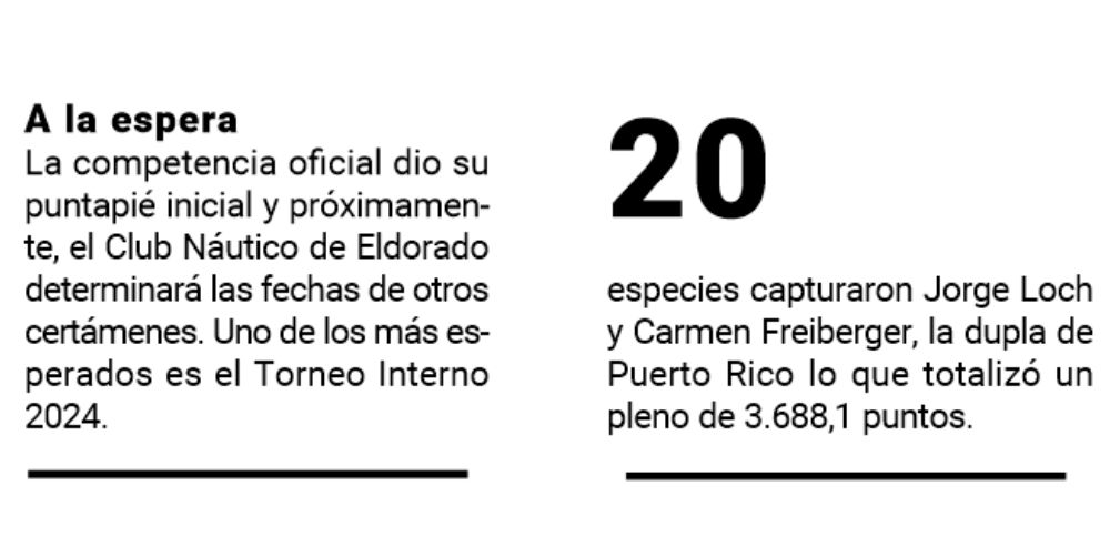 Con la finalidad de abrir oficialmente la temporada pesquera en la zona norte de la provincia, el club eldoradense desarrolló este evento especial, que tuvo buena concurrencia y contó con buen pique. La pareja ganadora, oriunda de Puerto Rico, se llevó el Challenger tras la captura de 20 especies y totalizar 3.688,1 puntos. Además, Freiberger recibió el galardón especial de la dama mejor clasificada.