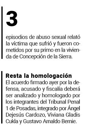 Un joven de 24 años que fue detenido el 2 de febrero de 2020 por abusar sexualmente de una prima que padece discapacidad mental, acordó ayer una condena de ocho años de prisión en juicio abreviado, alternativa ofrecida ayer por el fiscal del Tribunal Penal 1 de la Primera Circunscripción Judicial, Martín Alejandro Rau.