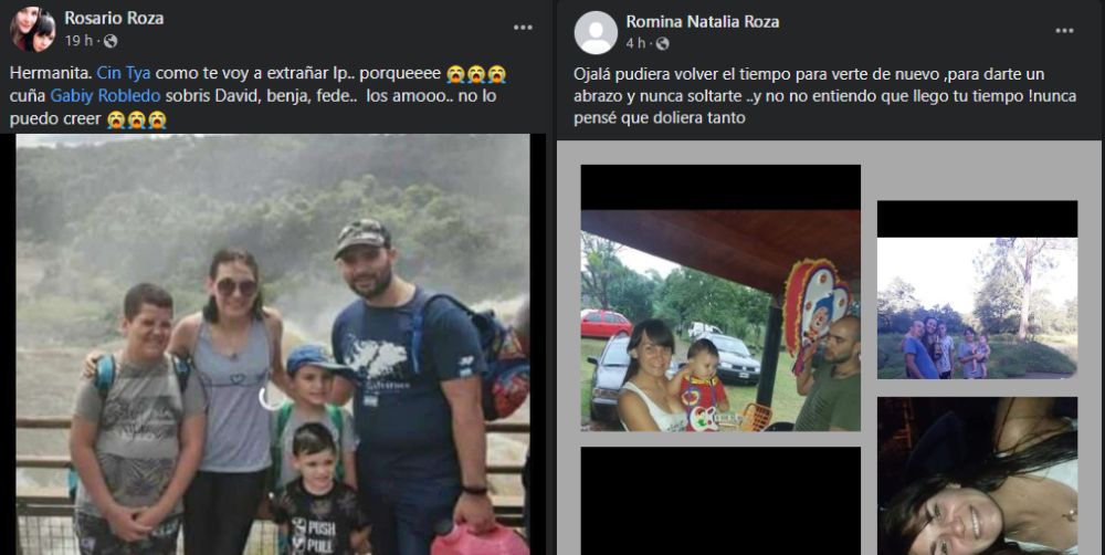 “Mi hermanita, mi amiga fiel y compañera de siempre. Mis pequeños, mis principitos, ahora los más perfectos angelitos Benja, Fede y David, y mi cuñado Gabi Robledo, los amo, siempre lo supieron y los voy a amar siempre. Quiero despertar de esta horrible pesadilla. Nos vemos en la otra vida”, expresó una de las hermanas de Cintia.