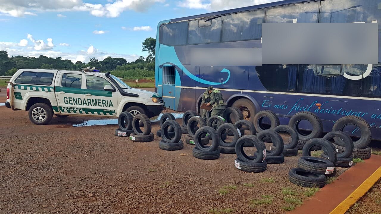 En un reciente operativo llevado a cabo por efectivos del Escuadrón 49 “San Vicente” en la Ruta Nacional Nº 14, se descubrió un caso de contrabando de neumáticos dentro de un transporte de pasajeros de larga distancia. El hecho tuvo lugar en el kilómetro Nº 996, donde el ómnibus se encontraba detenido inicialmente por un presunto desperfecto mecánico.