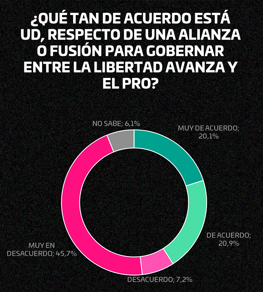 En materia partidaria, fue mayoría de opinión el rechazo a una fusión entre La Libertad Avanza y el PRO: 52,9% contra un 41% a favor. A su vez, el 45,4% consideró que Macri tomaría más poder que Milei dentro del Gobierno si se concreta la alianza política.