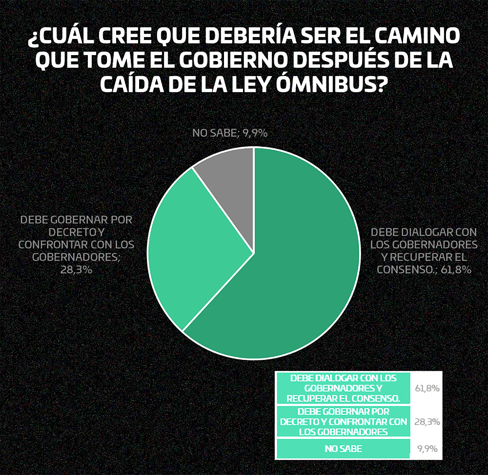 Luego se preguntó: ¿cuál cree que debe ser el camino a seguir por Milei tras la caída de su Ley Ómnibus? Un 61,8% reclamó que “debe dialogar con los gobernadores y recuperar el consenso. Mientras que un 28,3% apoya que gobierne por decreto y se enfrente a los mandatarios provinciales. El mayor apoyo a esta idea surgió de encuestas mayores a 31 años, aunque el segmento 16-30 años también se inclinó más por ella aunque en menor porcentaje.