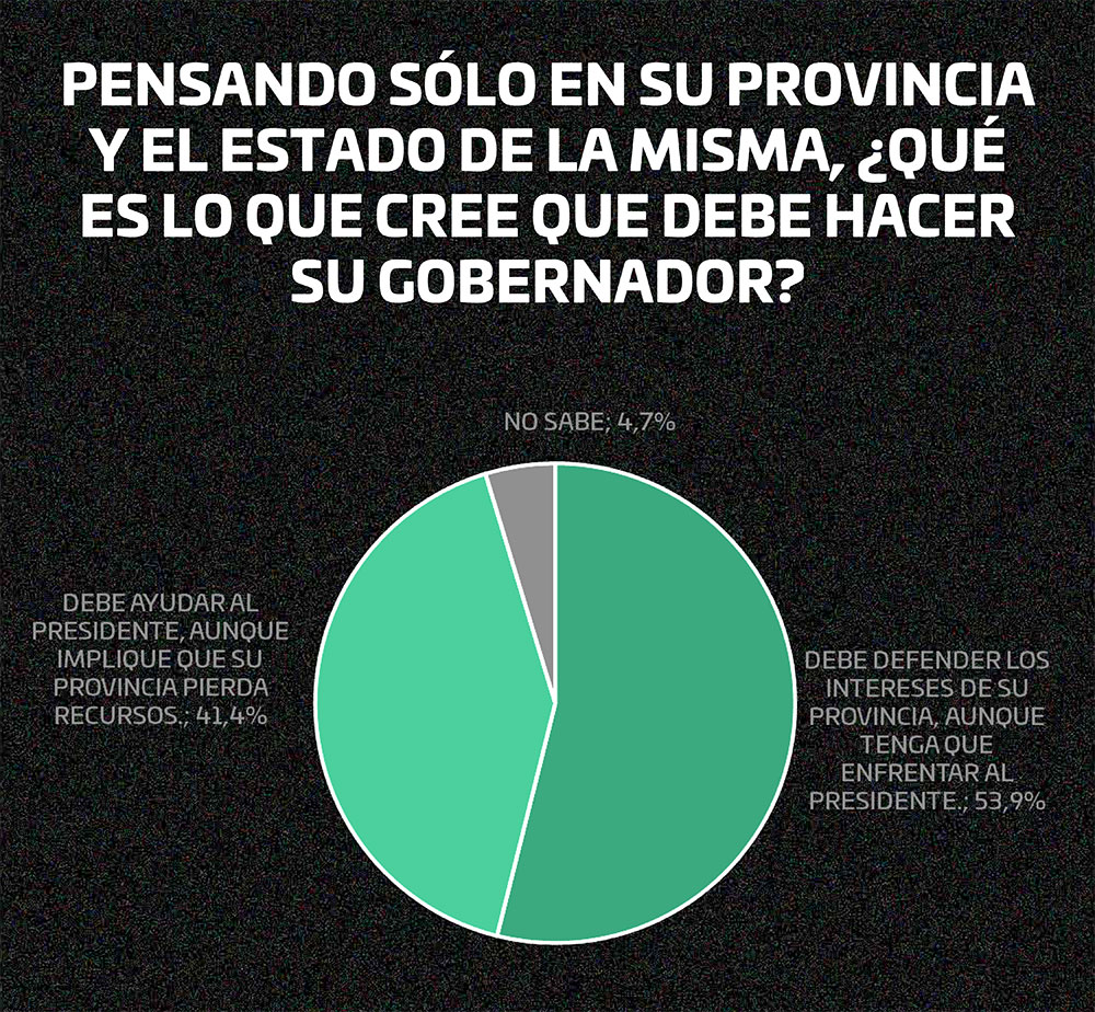 También se indagó qué deberían hacer los gobernadores. Un 53,9% dijo creer que “deben defender los intereses de sus provincias, aun cuando se deban enfrentar con Milei”. Mientras que un 41,4% les pidió “ayudar al Presidente, aunque implique que su provincia pierda recursos”.