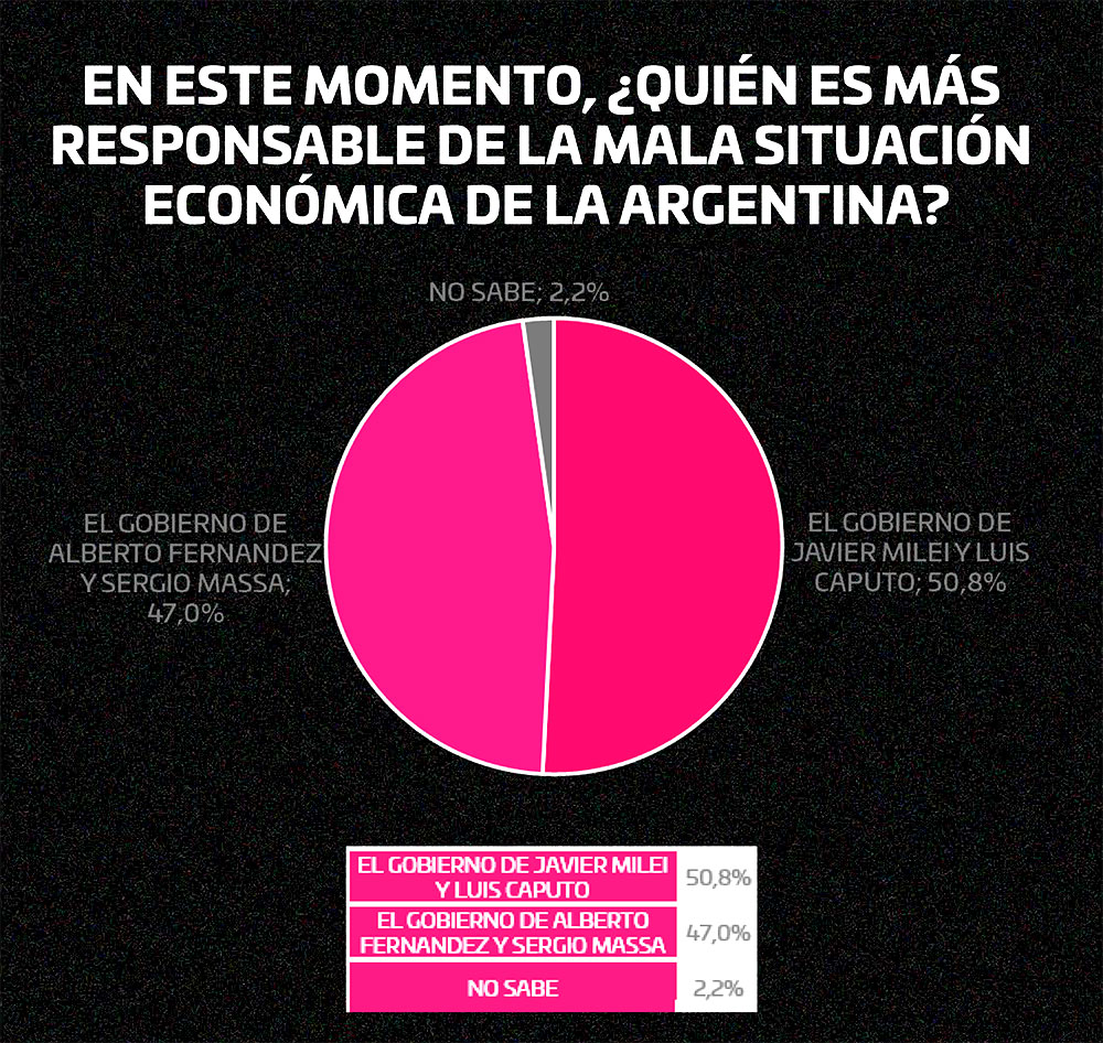 En otro capítulo, en el económico, se volvió a preguntar quién está pagando el ajuste y las respuestas no variaron mucho respecto a enero: lo paga más la gente que la política. Pero, levemente, se revirtió la opinión respecto a la responsabilidad por la mala situación económica: un 50,3% cree que es de Milei y el ministro Luis Caputo, contra un 47% que acusa a Alberto Fernández y Sergio Massa.