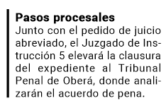 El acuerdo fue presentado al juzgado y seguidamente la etapa de instrucción será clausurada y elevada al Tribunal Penal de Oberá, en conjunto con la solicitud de juicio abreviado.