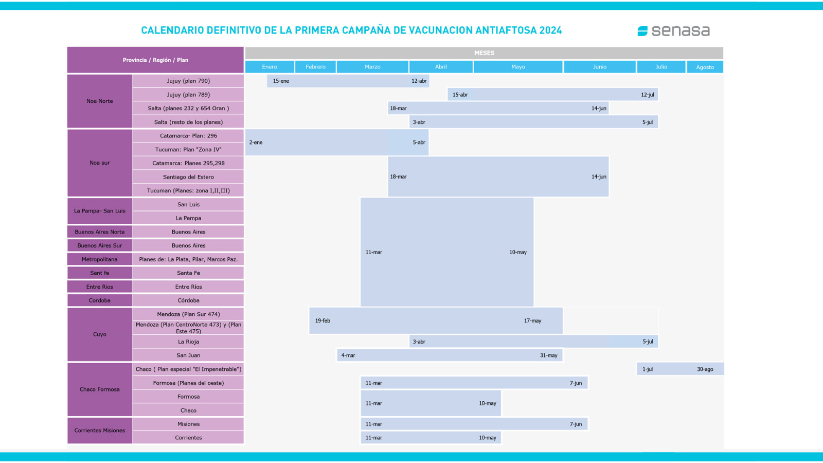 El Servicio Nacional de Sanidad y Calidad Agroalimentaria (Senasa) informó que, en marzo comenzará la primera campaña de vacunación antiaftosa 2024, en las provincias de la zona central y litoral del país donde se inoculará a la totalidad de las categorías bovinas y bubalinas, según el diagrama establecido.