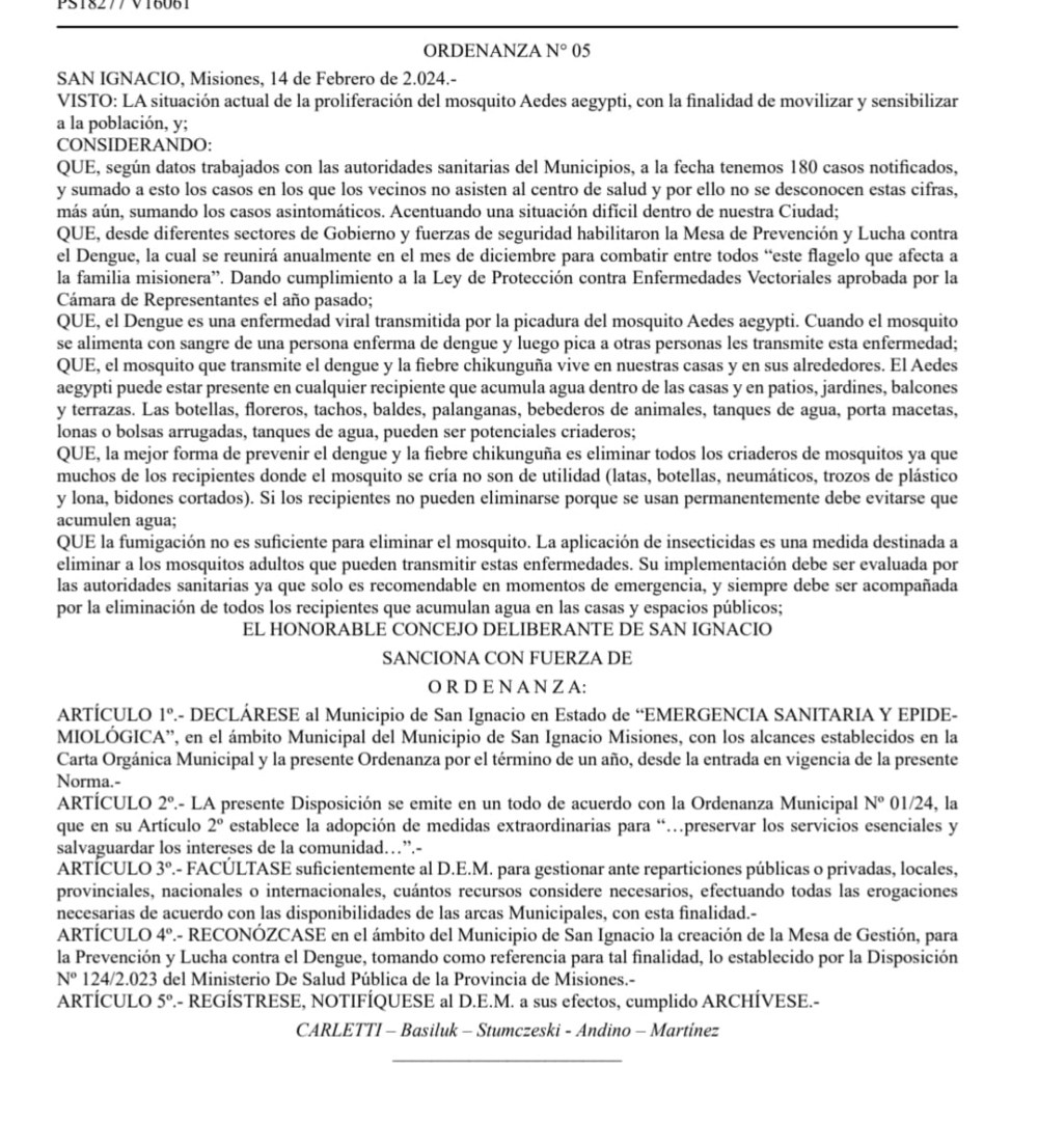 Tras su publicación en el Boletín Oficial , este jueves 22 de febrero entró en vigencia la ordenanza sancionada el 14 de febrero por el Concejo Deliberante de San Ignacio que declara al municipio en estado de emergencia sanitaria y epidemiológica por dengue.