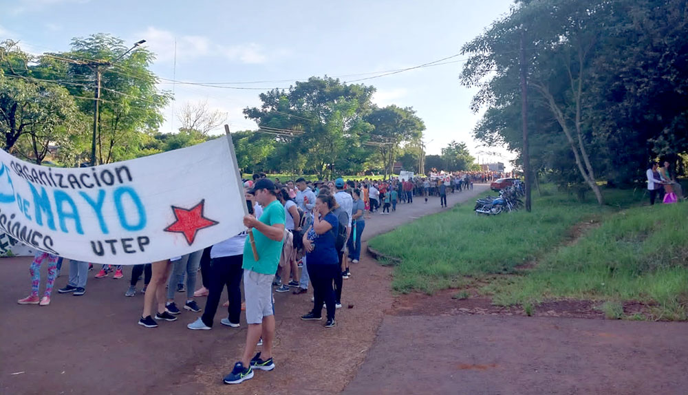 Casi en simultáneo, un grupo de aproximadamente 40 personas, hombres y mujeres, pertenecientes al movimiento social María Teresa Rodríguez (MTR), se congregaron en la Avenida del Té en Campo Viera. Estos manifestantes iniciaron una marcha a pie por la mencionada avenida, exigiendo alimentos para los merenderos de la comunidad.