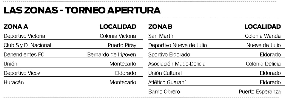 Con relación a los grupos, en el primero de ellos estará el actual campeón Deportivo Victoria, además de Nacional de Puerto Piray, Dependientes de Bernardo de Irigoyen, Deportivo Vicov y los montecarlenses Unión y Huracán, que animarán uno de los clásicos.