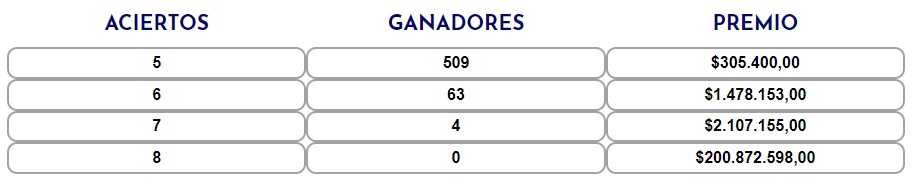 Por otro lado, el otro pozo de la “Mini poceada” (jugada de menor categoría), acumuló este viernes una suma de $6.649.037,00 para el primer premio con 5 aciertos.